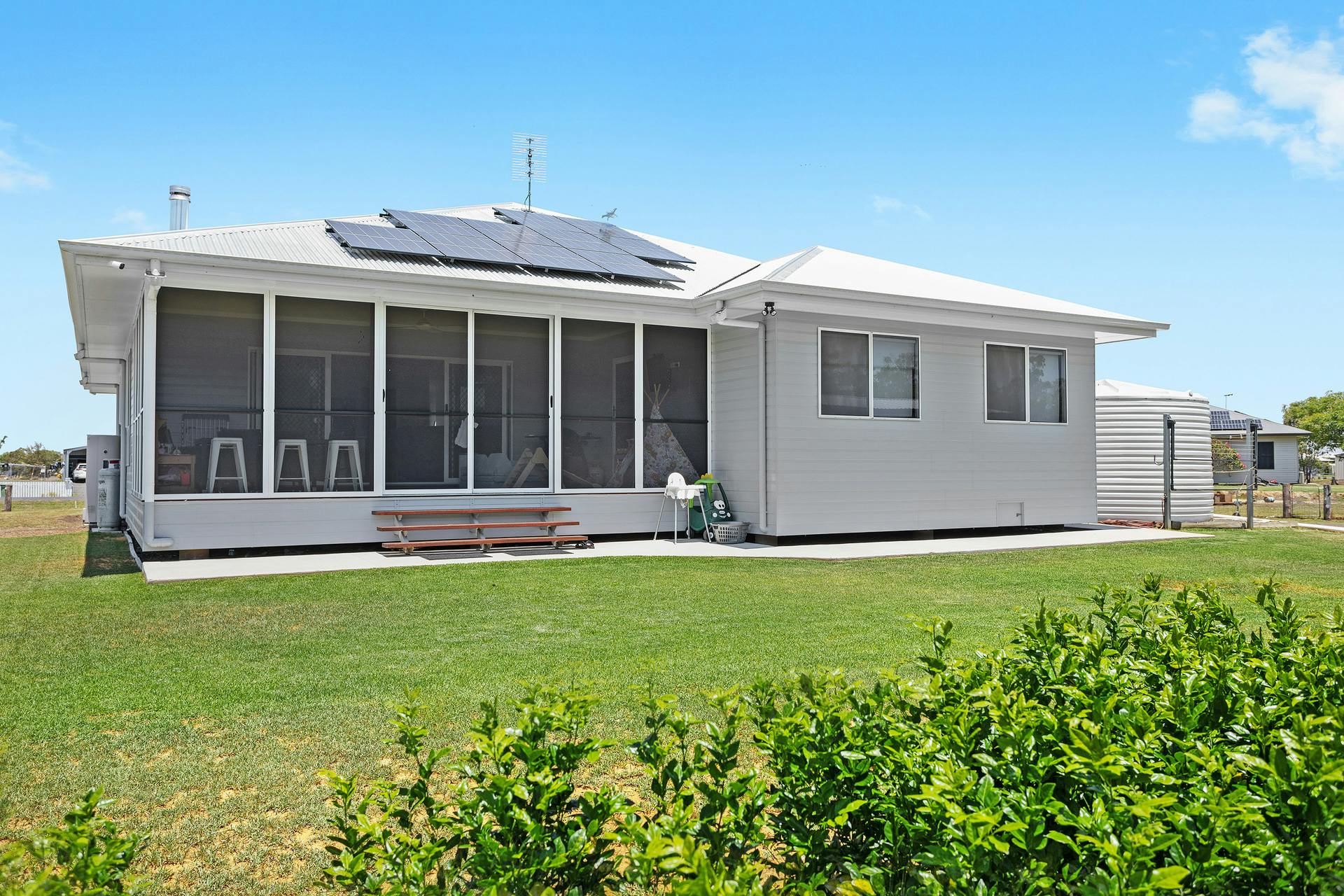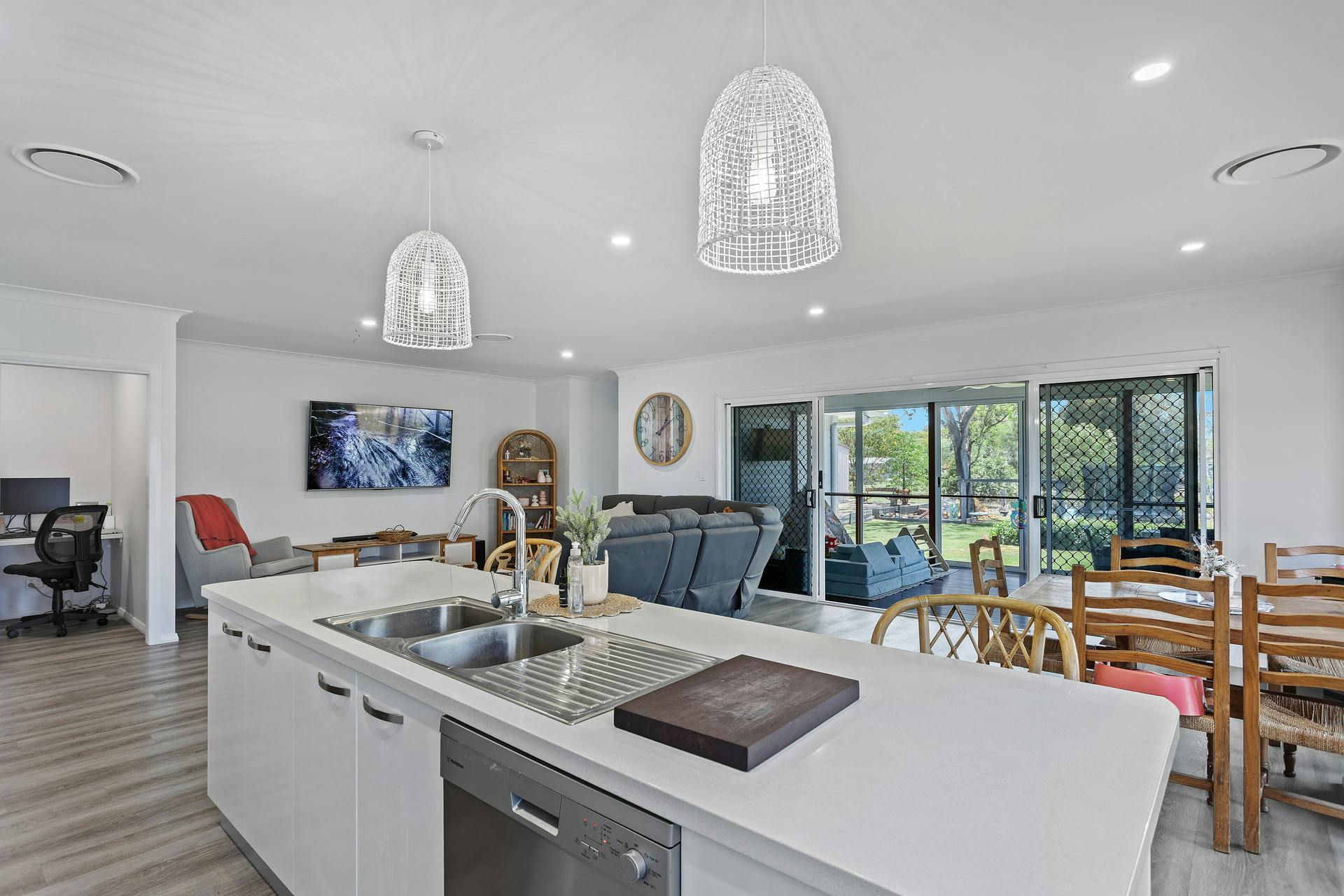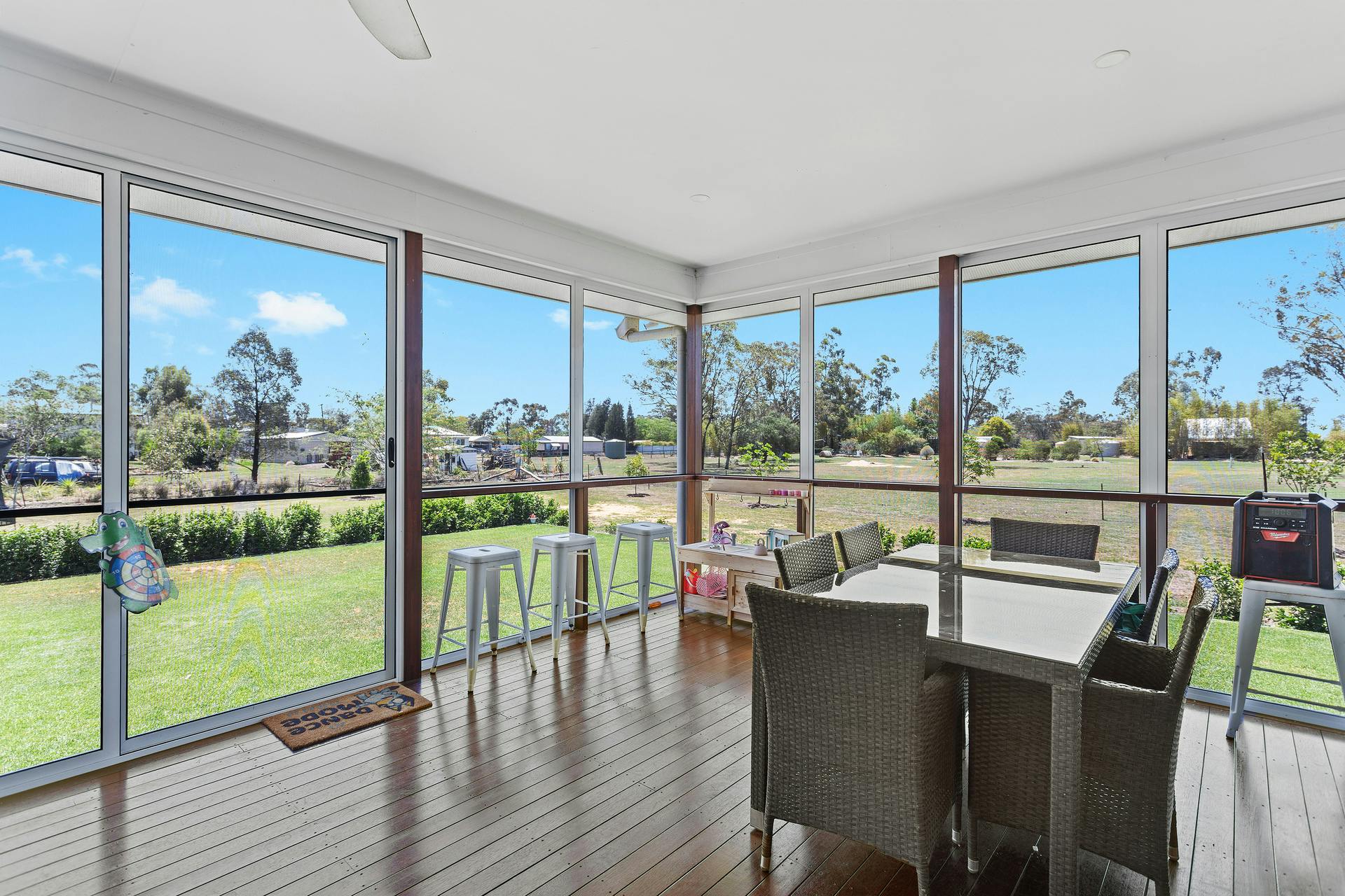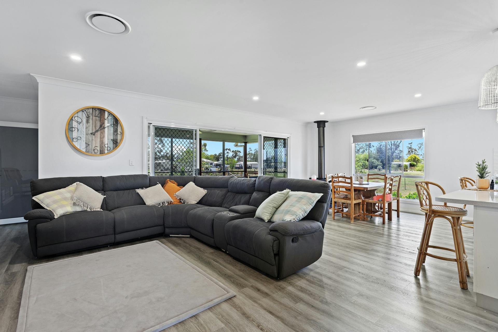 - Spacious open-plan living and dining area flowing to a fully screened entertaining deck