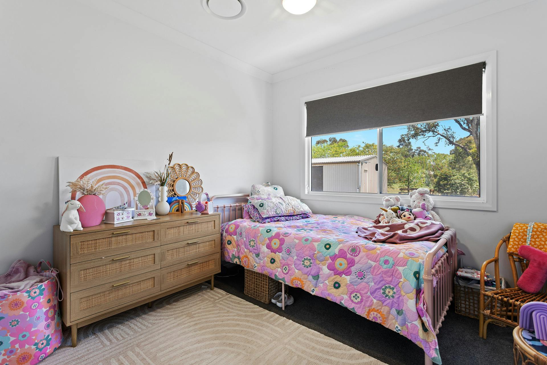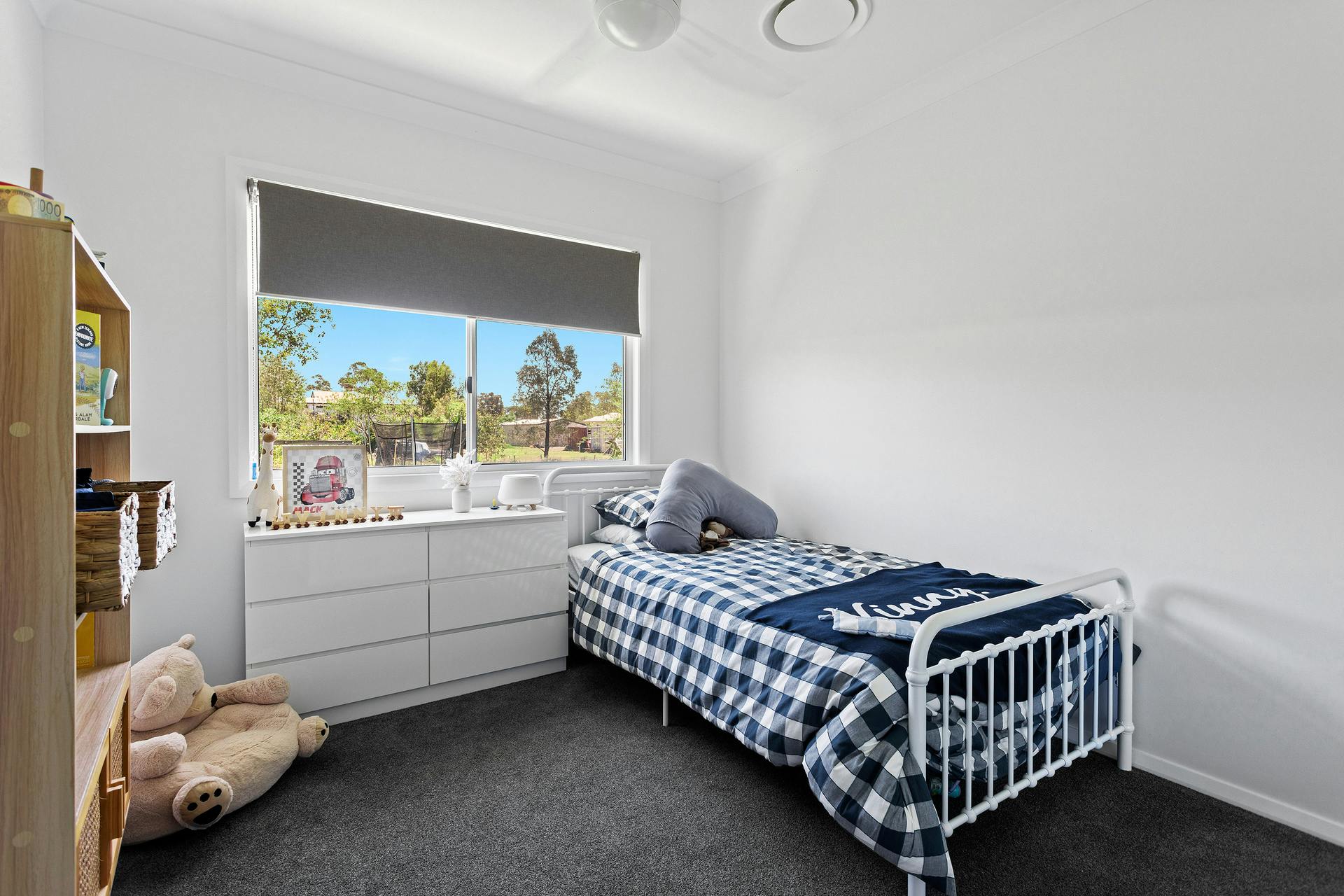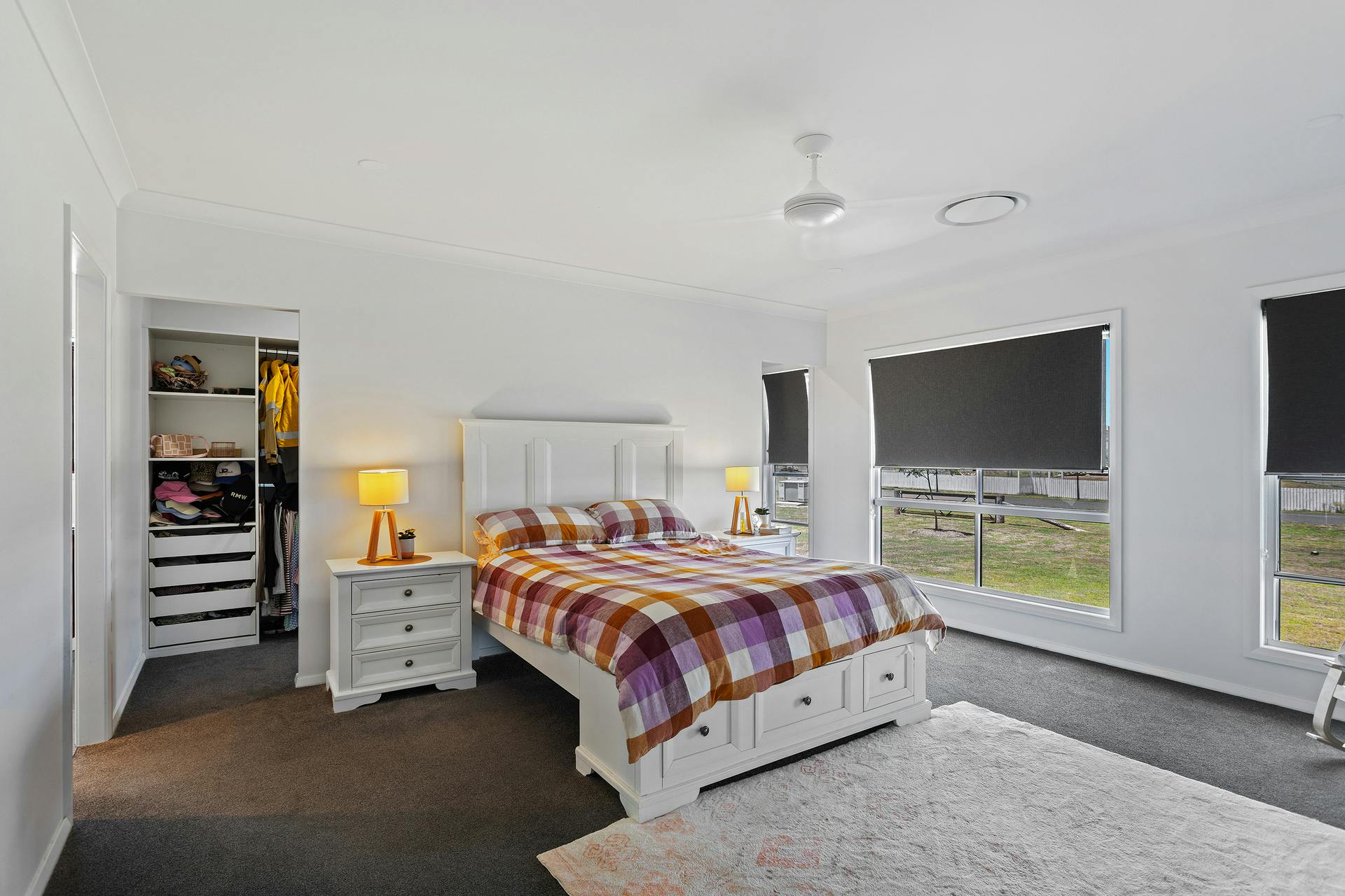 - Four generous bedrooms with high-quality carpet, built-in wardrobes, and ceiling fans