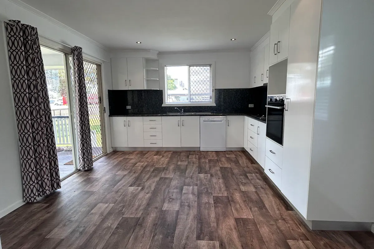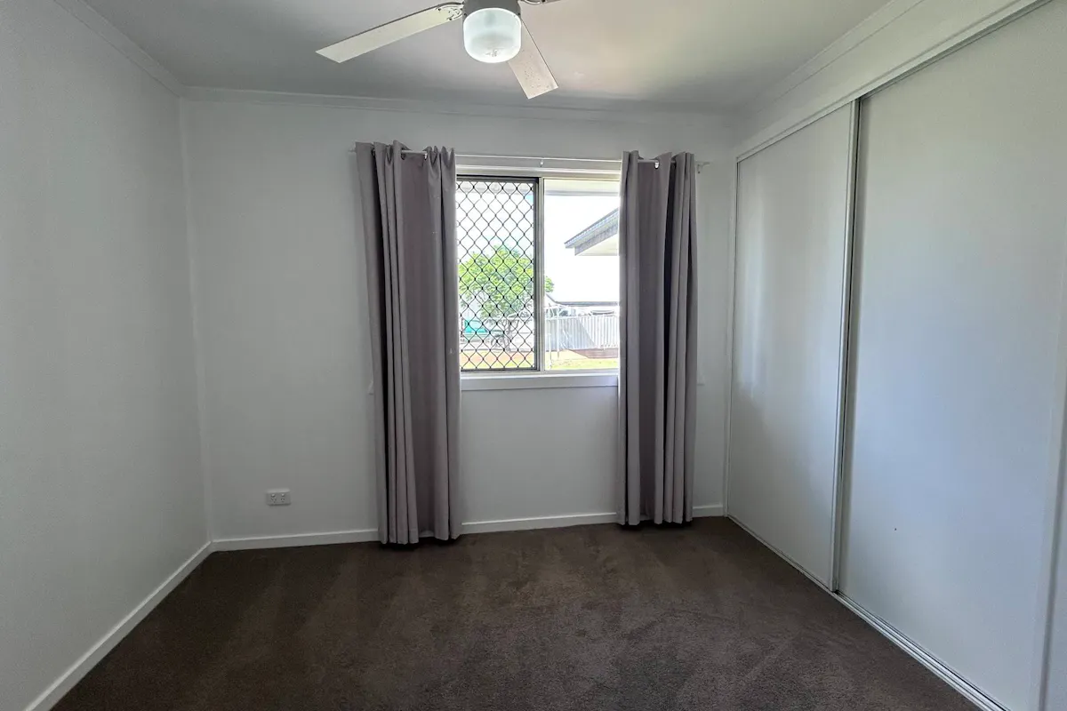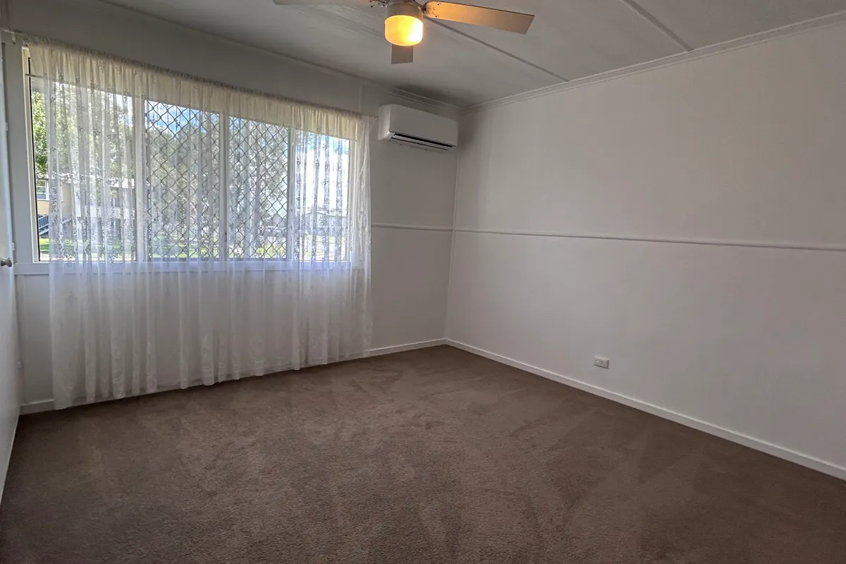 • Blinds in the kitchen and main bedroom, with curtains elsewhere
